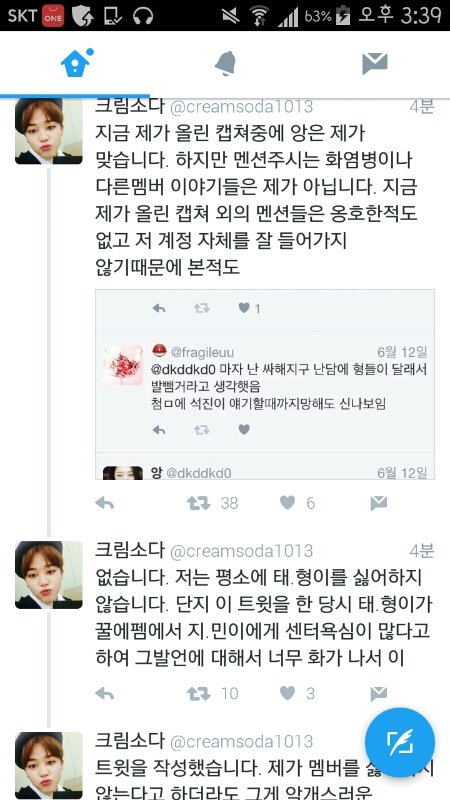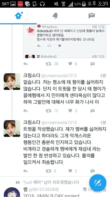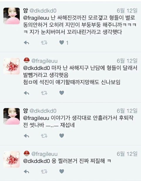 앙=크1림소다 저분이랑 젤1리 jimin said및 몇명이 비공계계정으류 3주년 꿀에펨때 태태 욕함 ㅋㅋㅋ 센터로 지민이 뭐라한다고 ㅋㅋㅋ 저게 악개가 아님 뭐임 ㅋㅋ