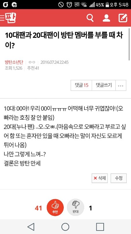 근데 20대(누나팬) 분 들은 멤버들한테 오빠라고 부르는 게 죄 짓는 것 같다던데ㅋㅋㅋㅋ 진짜야??