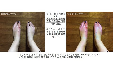 엄지발가락과 검지, 그리고 새끼발가락과 발의 옆면 등의 피부가 얼룩지듯이 그 부분만 붉게 변했고 몹시 따갑고 화한느낌이 들었습니다.