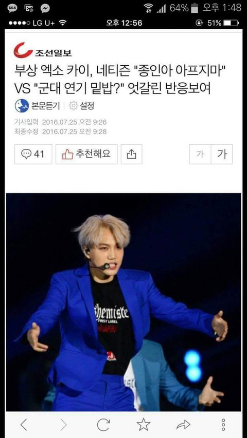 근데 요즘 잠잠해지더니 지네애들이 어디스케줄을 가네 뭐하ㄴㅔ~~ 이러면서 덕질얘기 시작하길래 계속 대화하다가 지네애들 자주아프다고 이번에도 누구 아팠다고 어엉엉 지랄해싸던데 위로해주다가 실은 우리종인이도 부상입어서 마음 안좋다는얘기 했는데 걔가갑자기 그럼카이군대못가겠네?? 평생 휠체어타고다님? 춤못추겠네? 너네 활동중단해야되는거 아니냐? 카이 군대못가는거임?? 군대안가? 이러면서 계속 군대얘기하길래 얘가왜이러나했는데 오늘걔랑놀다가 검색기록뜨는데 이거보고그런거더라ㅋㅋㅋㅋㅋ 조카 어이없어서;