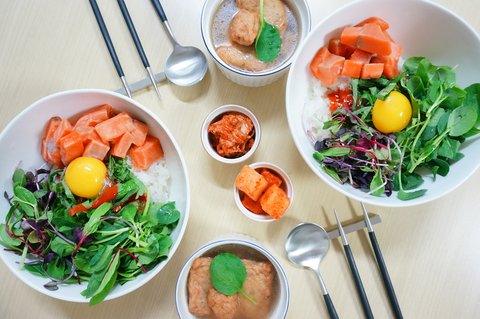 그릇에 밥넣고 연어올리고 갖은채소올리고 초장넣고 노른자 '톡' 넣어주면 완성!