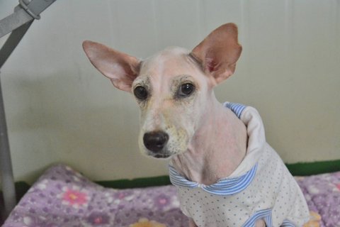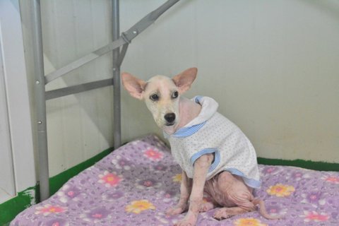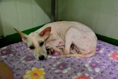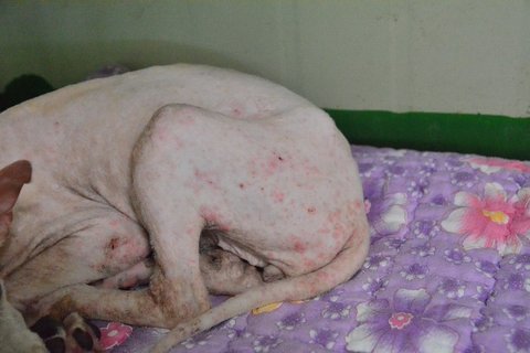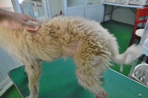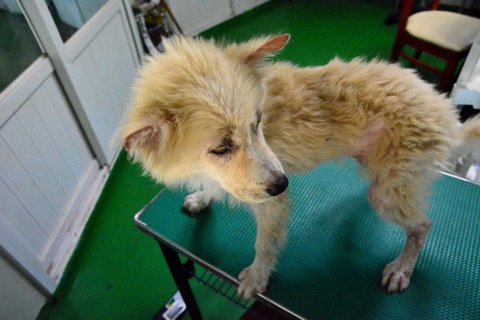 초록이를 처음 구조했을때 극심한 피부병과영양결핍으로 인해 뻣뻣해진 털때문에나이가 많은 아이인 줄 알았습니다.