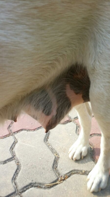 아이를 급히 데려와 씻기려 보니 젖이 불은 산모견이였습니다.