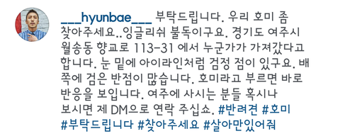 호미는 빅뱅 태양이 키우던 강아지로 현재는 형인 동현배씨가 기르고 있습니다. 그런데 오늘 누군가가 호미를 몰래 가져갔다고 합니다. 오늘 중복이라 혹시 나쁜마음을 먹고 개장수가 데려갔을까봐 너무 걱정이 됩니다. 제 강아지는 아니지만 모든 강아지키우시는 분들이 그렇듯 반려견을 잃어버렸다는게 얼마나 슬프고 안타까운일인지 알아서 작은 도움이나마 청하고자 글 올리게됐어요. 혹시 경기도 여주에 사시는 분들 혹은 그 근처에 살고계시는 분들중에 호미를 보신분이 있다면 인스타그램 @___hyunbae___로 연락부탁드립니다.