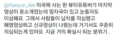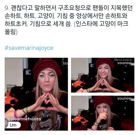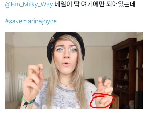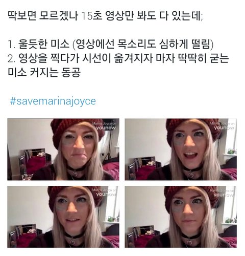 간단히 말하자면 영국의 마리나 조이스라는 뷰티 유튜버가 있는데 납치된 것 같다는 거야 근데 계속 사람들이 의문을 제기하니까 해명 영상을 올렸는데 그 영상에서도 계속 본인이 납치되어 있다는 표시를 해