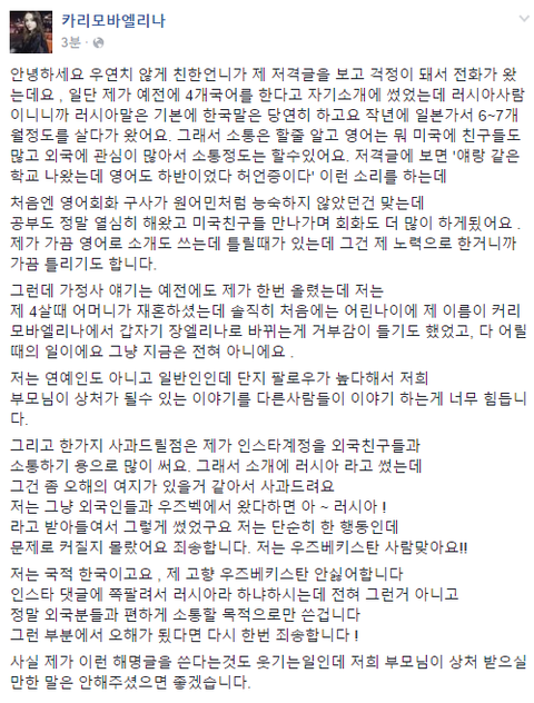 얘랑 같은학교 다녔는데 허언증 지림 4개국어를 한다고 영어도 못하면서 구라치고 얼굴 외국인이라서 페북에서 일부러 더 외국인처럼 보이려고 하는것같음 얘 이름 장엘리나임 국적 우즈베키스탄인데 러시아라고 구라치고 거짓말도 잘하고 욕도잘함 동상이몽에 나왔을때 지 캡쳐한거올렸는데 얘 고등학교 안다니면서 저 교복입고나옴ㅋㅋ화장도 못하는데 진짜 뷰티나와서 학교애들난리남 얘 알만한애들은 다 알거임 페북으로 이젠 좋아요 눌러달라고하고 관종인것같음