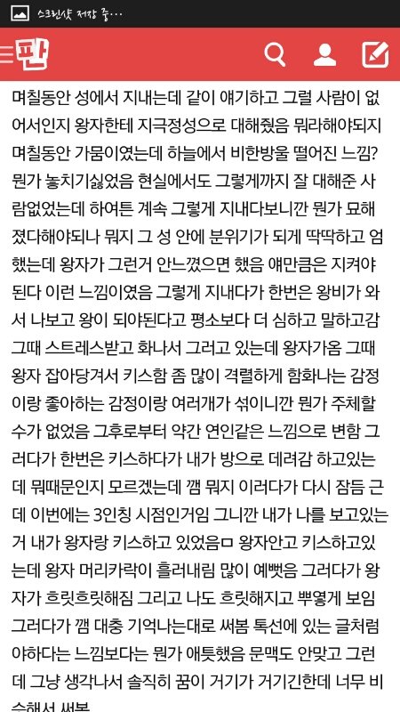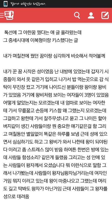 후기아닌 후기를 말하자면, 내가 판에 아까 서치를 했다가 이런 글을 찾았어. 그래서 결론은 이 글 쓰니를 찾습니다 내가 저 쓰니 글에다가 댓글 달았는데 원글에 못 쓴 내용을 더 덧붙이자면, 이복형은 갈색머리였어. 솔직히 고백하자면 나 다른 건 다 기억나. 왕 얼굴도 기억나고 왕비 얼굴, 성 내부 다 기억해. 심지어 나 말에 태워준 호위무사 갑옷 생김새도 기억하거든? 근데 이복형 얼굴이 기억이 안나 어제 학원 다녀오고 하다보니까 점점 기억이 흐릿해지는가 싶더니 이제 아예 안나 진짜 그렇게 기억하려고 애썼는데 도저히 안나. 근데 얼굴만 기억안나고 헤어스타일, 옷은 다 기억나. 이복형은 갈색 머리였고 흐릿해진 기억이지만 확실한건 진짜 잘생겼었어. 웃는게 정말 예뻤고 나한테 정말 다정하고 잘 챙겨줬었어 난 성 안에서 형만 믿고 지냈어 그리고 형이랑 나랑 보름달이 뜨던 밤에 성 테라스?난간?바깥 보이는 그런 데서 한번 키스했었음 그리고 내 기억으론 왕에게 왕비1 후궁1이 있었어 둘다 이복형이랑 나를 왕으로 만들려고 했고 어머니(왕비)는 당연히 내가 왕비의 아들이니까 왕이 되어야 하는데 후궁이 형을 밀어주는 것을 되게 못마땅하게 여기셨어 어쨌든 그래서 두 여인분의 신경전이 장난 아니었어 왕비 얼굴이 기억나는데 되게 하얀 피부에 갈색 머리 이건 정말 확실하게 기억나는데 헨리 8세(엘리자베스 여왕 아버지)즉위시절 드레스를 입고있었어. 아니 꼭 헨리 8세가 아니더라도 그게 중세시대 영국 드레스였던 건 확실한 것 같아 갑옷도 중세시대 영국 갑옷같이 생겼었고. 그리고 나랑 비슷한 꿈 꿨다는 쓰니야 댓글에도 적었지만 내 꿈에서 앞머리가 있었고 지금보다 머리가 조금 더 길었어 쇄골 넘고 좀 거지존 길이었는데 나 맞는 것 같니? 나도 저 글 보고 진짜 신기해서...이게 나름의 후기라면 후기야 미안 너무 재미없지 그리고 이건 진짜 부탁인데 혹시 저 글 쓰니 이 글 본다면 꼭 댓글좀ㅠㅠㅠㅠㅠㅠ나도 너무 신기해서...