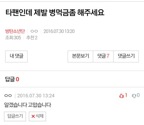 별빛분이 써주신글에 첫댓달았던 아미입니다. 빅스분들 팬톡에 와서 글남기는거 실례지만 오해는 풀어드리려구요. 최근 방탄팬톡에 어그로가 많아져서 무조건 공격적인 댓글다는 사람이 있습니다. 익명인지라 팬톡아미인지 구분못하는 경우가 저희도 많구요. 댓글 보고 기분상하지 않으셨으면 좋겠습니다. 톡선글이 어느정도 진정되고 나서 와서 많이 늦은 감이 있네요...사과문은 저희가 먼저 사과드리고 싶다고 해서 쓴 거 알고 있습니다. 언급을 안하려고 하시는 것도 잘 알고있구요 저희 사과문을 받아주셨는지는 제가 잘 모르겠지만 언급 피해주신점은 정말 감사드립니다 거의 이틀걸러 한번꼴로 방탄이 판에서 까이다보니 아미들의 다소 공격적인 말투에 상처받으신 것같은데요 그 글에서 사과요구하는게 별빛분들 아니라는거 잘 알고있어요. 휘말린 것도 기분나쁘실텐데 방탄팬톡에 쓰신 글에 또 상처받으신건가 싶어서 오해풀러 왔습니다. 해당사건에서 랩몬이 경솔하게 행동했던건 저희도 알고 있구요 시간이 너무 흘러버려서 지금은 저희가 사과드리는게 최선인것같습니다. 아직 병먹금이 제대로 되고 있지 않아서 오늘같은 일이 발생하게 되어서 유감스럽습니다. 혹시나 제 의견 중 잘못된게 있거나 문제가 되는게 있으면 댓글로 알려주시기 바랍니다. 그리고 팬톡에 이 글이 있는 걸 원치 않으시면 말씀해주세요 바로 삭제하겠습니다.