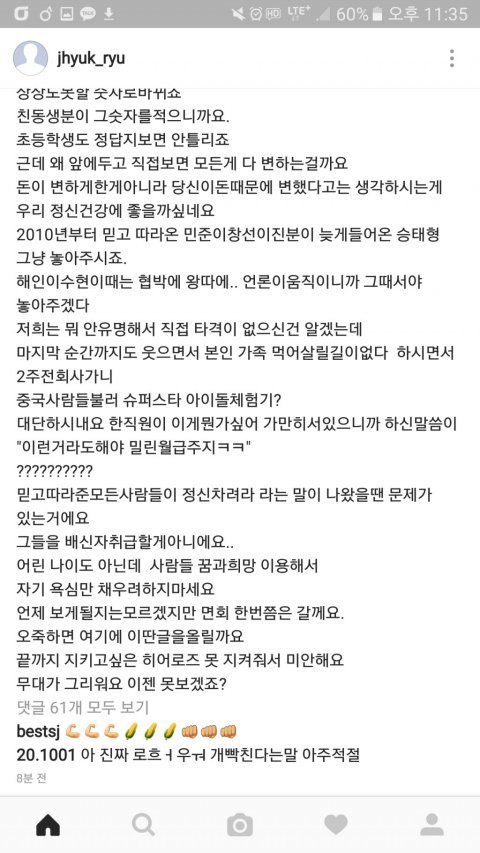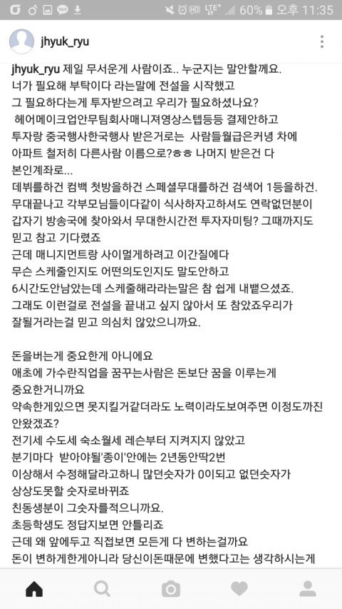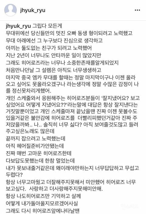 이런 상황에서 멤버 제혁의 SNS에도 글이 올라옴.