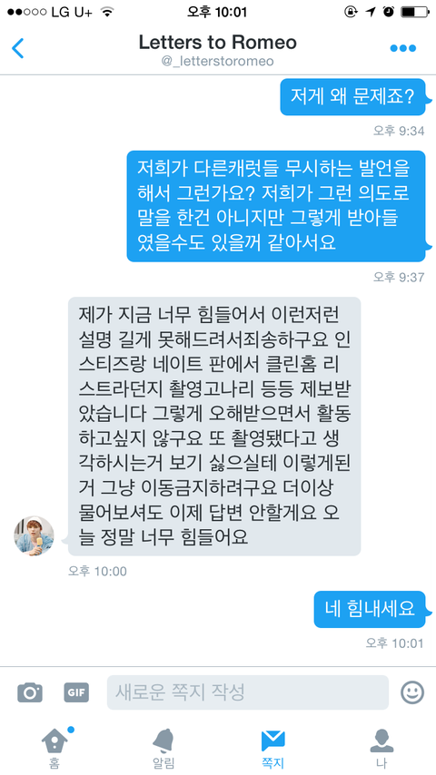 댓글 몇개없을때 보낸거라서 저렇게 보냈는데 갑자기 힘들다고 와서 당황해서 저렇게 끝냈어.. 그냥 열심히 덕질이나 하자❤️