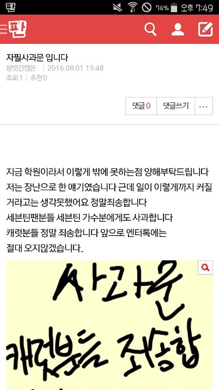 지금은 삭제됬는데 팬톡에 사과문이 올라왔어. 근데 그게 바로 저 위에 사칭한 사과문은 그대로 캡쳐한 거였어. (ㅇㄱㄹ가 사칭한 거)