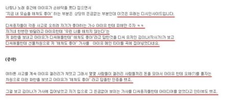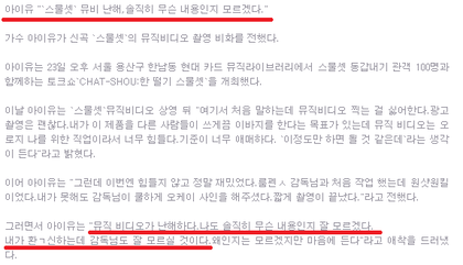 1) 스물셋 뮤비는 아이유의 노림수다? 논란글이 퍼지기 전까지만 해도 아이유는 뮤비내용이 무슨 내용인지 모르겠다고 해서논란글을 만드신 그 분들께 까였습니다. 자기가 찍는 뮤비 내용도 모른다고 말이죠.