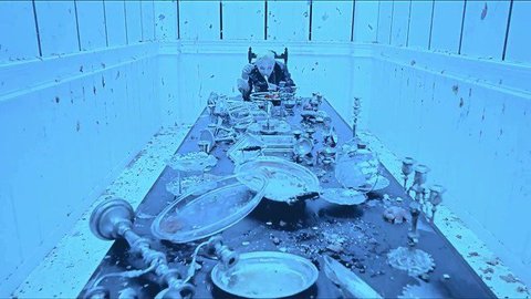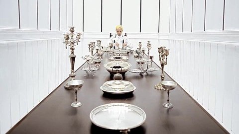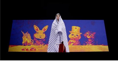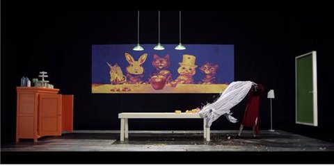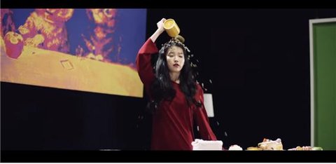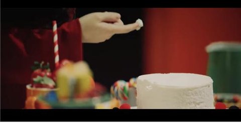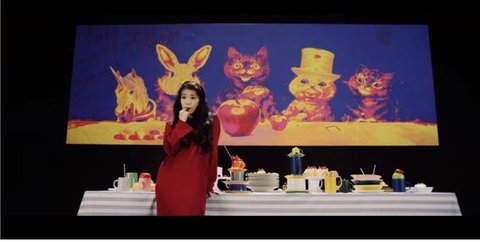 케익을 맛보고 뭔가 변한 아이유가 음식을 들이붓고 (감독 설명대로 앨리스의 tea party를 연상케 하는 테이블 세팅과 벽면의 고양이들과 토끼 그림이 보입니다.)