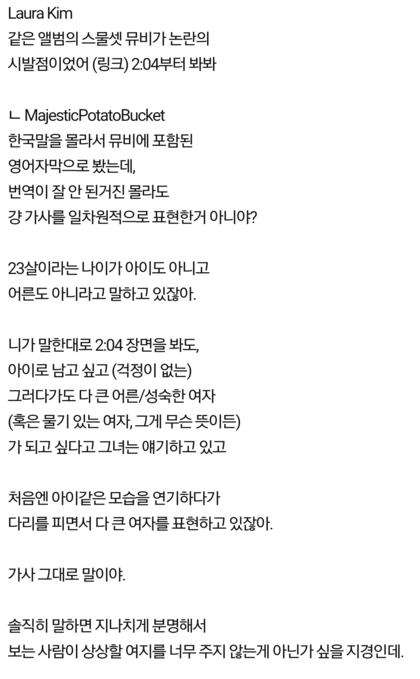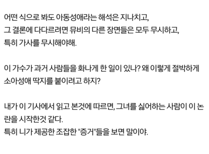 앞뒤 맥락을 무시하고 가사도 무시하고 뮤비를 뮤비로 보는 것이 아니라 실제 아이유에게 뮤비장면을 대입하여 23살이 젖병을 물고 있다고 해서, 로리타다!!하는건 앞뒤가 맞지 않습니다.