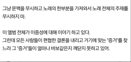 그렇습니다. 보는 사람이 상상할 여지도 주지 않고 가사를 일차원적으로만 따라간다고 팬이 아닌 입장에서 봐도 느낄 수 있습니다.