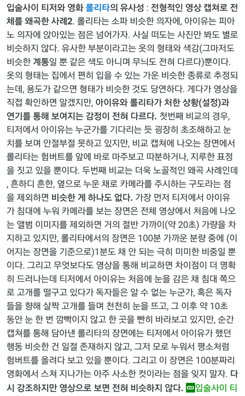 사실 자막을 안 보더라도 영상으로 보면 두 영상의 닮은 점은 정말 옷의 형태 정도밖에 없다는걸 알 수 있습니다. 그마저도 무늬도 색감도 완전히 다릅니다.긴 설명 필요 없이 영상만 보고 와도 오히려 유사하다는 점을 찾기가 더 어렵습니다.옷은 집에서 편하게 입을 수 있는 파자마 비슷한 원피스 같은데, 이 역시 흔하게 입는 옷일 뿐입니다.브이넥 원피스만 입으면 다 로리타가 되는 것인가요?타이틀곡 분홍신에서도 알 수 있듯이 모던 타임즈에서의 아이유는 대놓고 섹시 컨셉에 가깝습니다.기존의 소녀 컨셉에서 숙녀가 된 성숙미를 보여주는 활동이기에 (분홍신만 봐도 너랑 나 때의 귀여움과는 완전히 다르죠.) 입술 사이 티저는 로리타가 아니라 그냥 21살 아이유가 '나 이만큼 섹시해요' 하고 보여주는 아슬아슬한 연출일 뿐입니다.