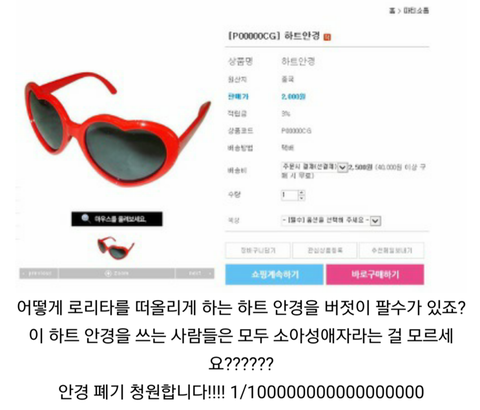 그분들은 빨간 하트 선글라스는 빼박 로리타 컨셉!! 이러던데 이 사진 역시 수록곡 '안경'의 자켓 사진입니다. 그래서 안경을 끼고 있는 걸 찍었을 뿐 특별히 의미는 없는데다가, 이건 앨범에 실리지도 않은 B컷입니다. 따라서 뭘 암시했다고 주장하는 게 상당히 쓸데없습니다.그리고 다시 말하지만 이 사진은 앨범의 '안경'이라는 곡의 사진입니다.하트 선글라스는 흔히 학생들의 체육대회에서도 쓰는 것을 본 적이 있는, 말 그대로 아무 생각 없이 사람들이 패션 아이템으로 착용하는 물건입니다.롤리타가 하트 선글라스를 쓴 포스터는 오히려 일반 대중들은 알기가 어렵습니다.바로 로리타의 포스터를 떠올리고 '아이유=로리타'라고 연관 짓는 사람들을 제외하고 일반인들은 아무도 로리타를 떠올릴 수가 없습니다.나 역시도 흔하게 쓰이는 하트 선글라스가 로리타의 포스터에 나왔다는 걸 모르고 있었습니다.