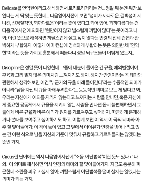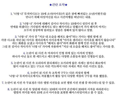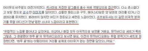 '무엇을 골라도 답이며 그저 당신이 뭘 믿고 싶은지에 달렸다' 제 해석과 뮤비감독의 해석이 꼭 정답이란 뜻은 아닙니다. 다만 아이유의 말과 감독의 말, 앨범컨셉, 앨범소개를 토대로 해석한 글과 보이는대로 느낌이 로리타같아서 맥락을 무시하고 해석한 글 둘 다 생각해보고 아이유란 사람을 평가해야 되지 않나 싶어서요