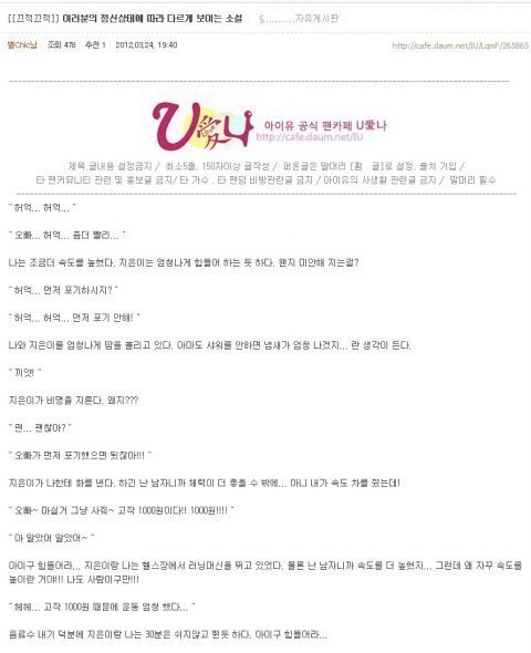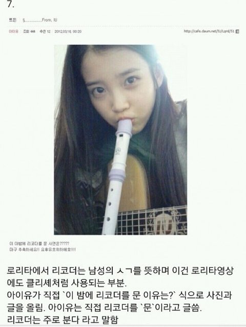 대체 무슨 포르노나 야애니를 보면 리코더를 문 걸 보고 펠x치x 같은 게 떠오를 수 있는지.수많은 로리 캐릭터가 쏟아져나오는 일본애니에서조차 나는 리코더가 남성의 성기를 뜻하는 장면은 없습니다. 게다가 저 사진은 아이유 스무살의 봄 앨범에 들어갈 복숭아란 자작곡 속 리코더 연주를 연습하고 있었는데 연습할때 사진을 팬까페에 올린 것입니다.6)뮤비에서 나왔다는 하악하악 장면