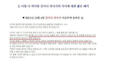 아이유의 너랑 나는 평균 연령대가 어린 걸그룹들이 노출을 하거나 몸매를 과시하는 퍼포먼스를 하는 것보다 오히려 '로리타'와는 거리가 아주 멉니다. 단순히 '소녀 컨셉'을 로리타라고 매도한다면 현재 청순소녀 컨셉을 표방하는 다른 걸그룹들도 로리타 프레임에서 자유로울 수 없고, 실제로 어떤 사이트에서는 여1자1친구나 다른 소녀소녀한 걸그룹들에게도 로리타 혐의를 덮어씌우고 있는걸 본 적이 있습니다. 그렇게 따지면 로리타 컨셉의 원조는 소1녀1시대를 넘어 핑클까지 거슬러 올라가게 됩니다.