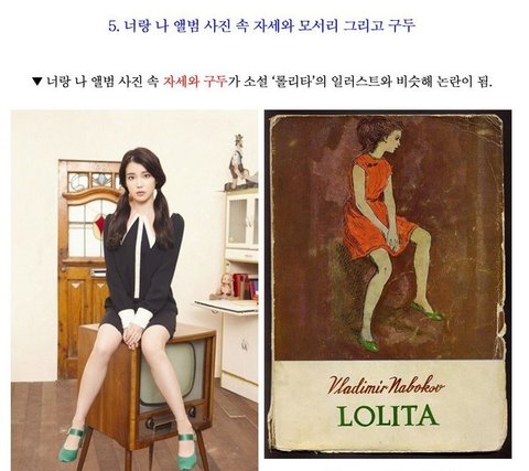 아래 사진을 보면 알겠지만 아이유의 그 화보는 너랑 나의 수많은 화보 중 하나의 포즈에 불과하고, 비슷하다는 책의 표지 또한 1950년대부터 지금까지 출판된 수없이 많은 롤리타의 표지 중 하나일 뿐입니다. 게다가 구글에서도 2014년이 되어서야 올라온 표지입니다. 너랑나 앨범은 2011년에 나왔고요. 답 나온거 아닌가요? 또 무표정 양갈래 소녀 또한 로리타 클리셰가 아닙니다.