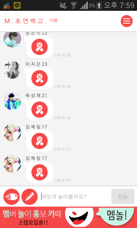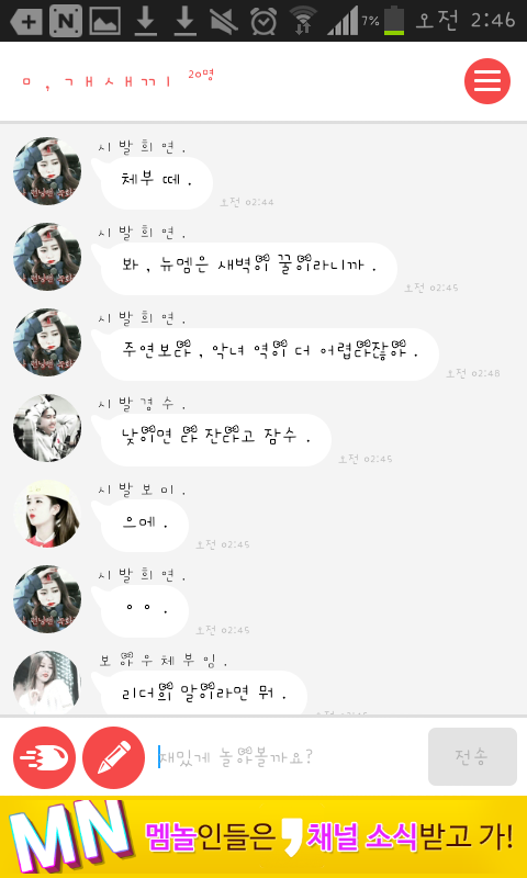 나 초6때 처음 스마트폰사서 애들이 막 멤놀하자길래 처음해본 멤놀이 밴드에서 하는거였는데 진짜재밌었음 지금생각하면 조카흑역사인데 막 임관이랑 남장 여장 이런거 하지않았음?ㅋㅋㅋㅋㅎ 그리고 엄마한테 들켜서 멤놀접었다가 중1들어오면서 다시 뽐뿌생겨서 잼?이라는 어플이 한참 인기많길래 그기서 멤놀했었음ㅋㅋㅋ하