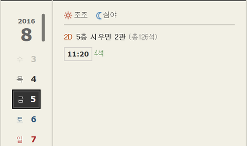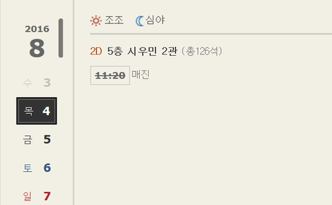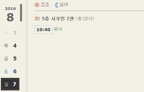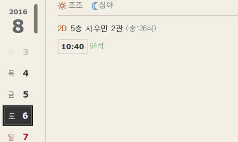 지금 상황 궁금해서 한번 들어가 봤거든 목요일 표는 이미 매진... 나도 내일 갈껀데 어제 예매 안했으면 못볼 뻔 했었네 ㅋㅋ 금요일 표도 4매 밖에 안 남았고 근데 보니까 토, 일요일 10시 40분에 1회씩 상영이 추가된거야!!! 어제는 분명히 금요일까지밖에 상영계획이 없었는데 말이지 이렇게 기쁠데가 ㅋㅋㅋㅋ 혹시 평일 시간 안되어서 아쉽던 웅녀들은 예매창으로 ㄱㄱ 견이를 한번 더 볼 수 있는 좋은 기회야