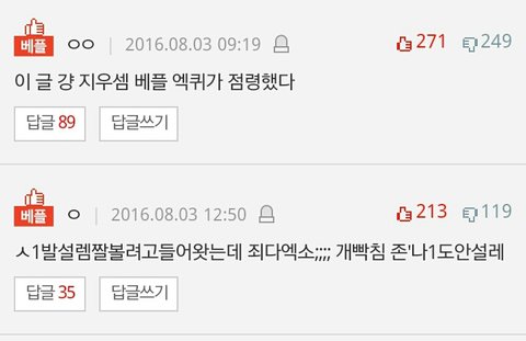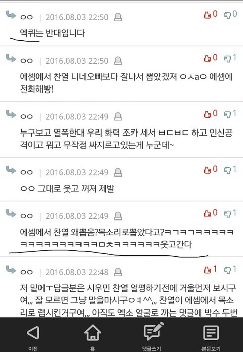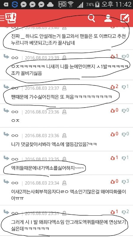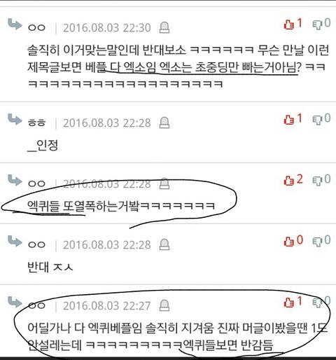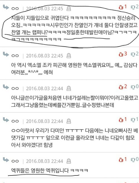 엑소팬들이 사람들이 공감하지않은 짤을 올리는게 문제일수도있지만 베플이될줄 모르는상황에 된거일텐데 한순간에 벌레취급하며 바퀴벌레로 몰아가기 일수가 됨