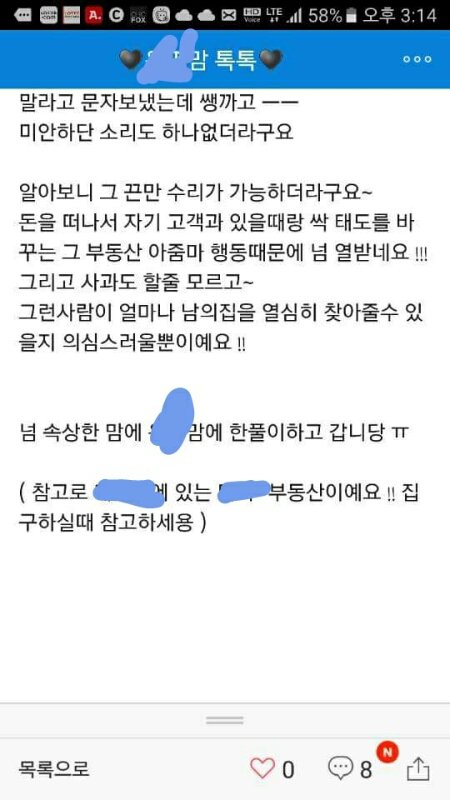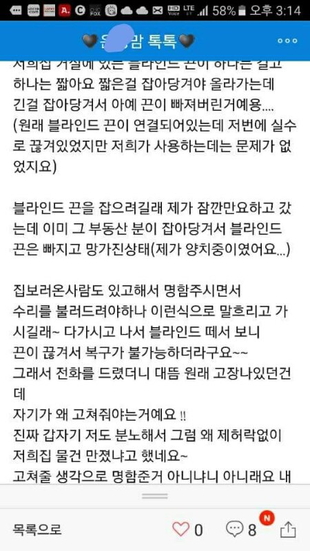 안녕하세요. 저는 서울시에 살고 있는 중학교 2학년 여중생입니다.저희 엄마는 동네에서 작은 부동산을 하고 계십니다. (실장님이십니다.)제목처럼 집을 내놓으신 한 아주머니 때문에 부동산의 이미지가 정말 나빠져 어떻게 해야 될 지 모르겠습니다.. 편의상 아주머니를 A라고 하겠습니다. 오늘 점심시간에 집을 구하고 계시는 손님께서 A분의 집이 보고싶다 하셔서, A분과 약속을 해서 집에 약속시간에 갔습니다. 문을 세번 이상 두들기고 계세요를 많이 했더니 나오셨다고 합니다. 손님분은 더운데 그런 상황이 일어나서 그때부터 기분이 썩 좋지 않으셨다고 합니다. 집을 보던 도중 집구조가 창에 햇빛이 바로 들어오는 집이라, 블라인드가 되게 큰게 있었습니다. 손님분께서 블라인드를 올리고 어떻게 빛이 들어오고 경치가 어떤지 보고싶다 하셔서 저희 엄마는 블라인드를 올리려 하셨습니다. 근데 긴 줄과 짧은 줄이 있고, 그때 A분께서는 양치중이셔서 저희 엄마께서 긴 줄을 잡아당기셨습니다. 그러자 블라인드 줄이 끊어져버렸습니다. 저희 엄마께서도 놀라시고 A분도 놀라서 뛰쳐나오시고 그러니까 좀만 기다리지!! 라고 하셨습니다. 여기까지는 저희 엄마가 물어보지 않고 잡아당겼기 때문에 당연히 잘못이라고 생각합니다. 저희 엄마는 정말 죄송스러운 마음에 명함을 건네 드리고 고개 숙여 정말 죄송해요 고의로 그러려고 그런게 아닌데 죄송합니다.. 라고 계속 사과를 하셨고 A분께서도 원래 고장이 나있었는데 그걸 잡아당기니까 이렇게 된거 아니냐, 됫다. 라고 하셨습니다. 그래도 저희 엄마께서는 수리비는 제가 낼테니 연락 주시라고 하시고 집에서 나오셨습니다. 그러자 얼마 안되서 A분께 전화가 왔습니다. A분은 " 수리해주실꺼죠?" 라고 하셔서 저희 엄마는 수리해드린다고 하셨습니다. 그리고 원래 고장이 나있었냐고 물어보셨는데 고장이 나있던 안나있던 그게 문제냐, 기가 막힌다, 왜 오히려 당신이 더 화를 내냐, 앞으로 연락하지 마라 하고 전화를 끊으셨습니다. 저희 엄마는 기가 막히지만 그래도 손님이니, 화는 내지 않고 수리비 드린다고 하셨습니다. 여기까진 괜찮았습니다. 그런데 A분께서 저희동네 00구 학부모님들, 주부님들이 운영하고 즐겨하시는 카페에다가, 조금 과장을 해서, 저희 엄마께서 잘못을 100퍼센트 하신것처럼 올리시고 저희 부동산 동네 이름과 이름 세글자중 두글자를 써놓으셨습니다.. (ex) 행복한 이면 행복*) 저희 엄마 부동산 이름은 조금 특이해서 두글자만 나와도 동네 주민분들께서는 알아보실 수 있을만 한 정도였습니다. 정말 속상합니다. 엄마는 원래 살다보면 저런 사람도 있는거다. 괜히 일벌리지 말아라 라고 하셨지만 속이 상해서 잠이 안오네요.. 저희 엄마 전화로 욕하는 손님이 계셔도 한번도 엄마도 욕하면서 화낸적 없고 침착하게 대응하셨고요, 죽여버린다고 하는 손님께도 오히려 마지막엔 죄송하다는 말 들으면서 훈훈하게 끝내시고 한번도 나쁜중개사라는 말 들어보신적 없는 분이십니다. 오히려 00구 친절중개사 1위도 매일 하시는 분입니다.. 요새 손님이 많이 없어서서 많이 힘들어하시는데 그 카페에 올라온 글로 더 이미지가 나빠질까, 아니 나빠져서 정말 걱정입니다.. 댓글을 못달게 하고 아예 저는 그 게시물을 확인할 수 도 없어서 더 답답합니다. 그 게시물이 올라온건 엄마가 캡쳐를 해서 보여주셨는데 저는 가입이 안되서 더 속상하고 애가 탑니다. 엄마께서 일을 벌리지 말라고 하셨지만 그 분도 카페에 글을 올려서 많은 분들이 보시는데, 왜 저희엄마의 관점에서는 보시면 안되나 하는 생각에 글을 쓰게 되었습니다. 혹시라도 이 글을 A분께서 보고 계신다면, 게시글 내려주시고 저희 엄마께 사과 한마디라도 해주셨으면 좋겠습니다. 엄마보다 나이도 어리신데 소리 지르고 막 대하신거 정말 딸로써 보기 힘들고 너무 속상합니다. 그리고 전국에 계신 소위 말하는 '진상손님'들! 집을 신중히, 현명히 보고 고르는건 좋습니다 하지만 중개사분들은 손님들의 노예가 아닙니다 ㅠㅠ.. 정말 말그대로 중개해주시는 분들이지 여기 저기 다 보고 정말 계약 직전까지 가시고 해약하시고 다른 부동산에서 계약하시고.. 별의 별 손님들 많으신데 중개사님들 입장에서도 한번만 생각해주세요ㅠㅠ 급히 써서 횡설수설한 점 죄송합니다. 딱히 A분을 찾으려고 이러는건 아니지만 속이 상해서.. 판에다가 글을 끄적이게 됬네요 ㅠㅠ 다들 좋은 밤 되시고 톡커님들은 이런 일 없으셨으면 해요ㅠㅠ!