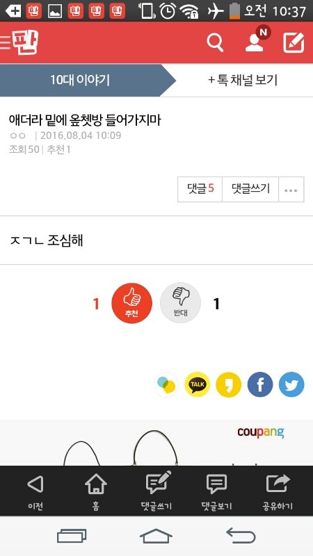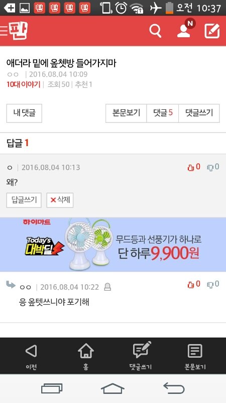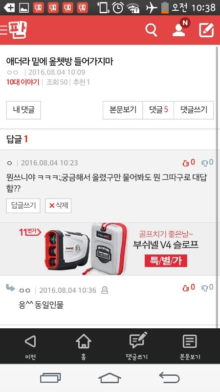어떤 애가 오픈채팅방 들어가지말라해서 뭔일있나해서 왜??라고했더니 나보고 응 너 오픈채팅쓰니 이따구로 대답함ㅋㅋㅋㅋㅋ;; 아니라고하는데도 왜 궁예질임?? 아 진짜 조카 어이없다 사람이 아니라는데 계속 우겨대;