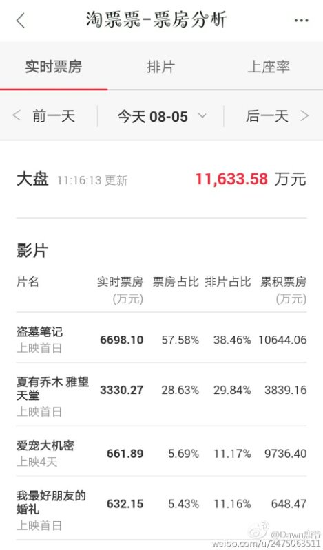루한 주연영화 도묘필기 8월5일 현재 중국시간 11시 좀 넘는 불과 몇시간만에 중국 박스오피스 누적 흥행수익 1억 위안돌파 ㄷㄷ