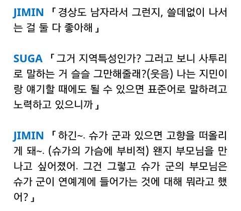 현실 ver 지민- 아 긍데 윤기형이랑 저랑 경상도에서 와서 그런가 둘다 뭔가...맨날 쓸데없이 참견하게되는거 가태여 (망개웃음) 윤기- 그런거지 이제...그..지역특성 같은거...(멤버들 수긍중) 아 근데 너 사투리좀 그만써 난 지금도 안쓸라고 노력중인데 (입동굴) 지민- 흫ㅎㅎㅎ아니 뭔가 윤기형 보면...그런게 있어여. 고향생각 나구 막...(호석이 물개박수╋희망웃음) 아 부모님...부모님 보고싶네여.네.(망개웃음) 아 근데 윤기형 부모님은 형 음악하능ㅇ거 뭐라고 안하셨어여?