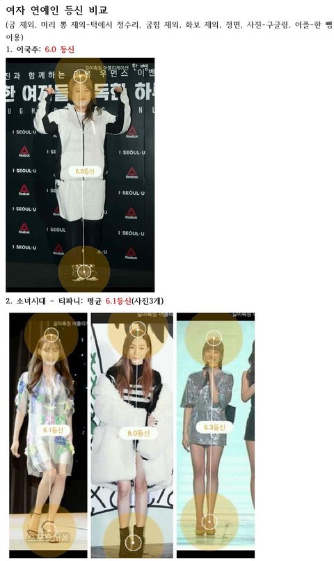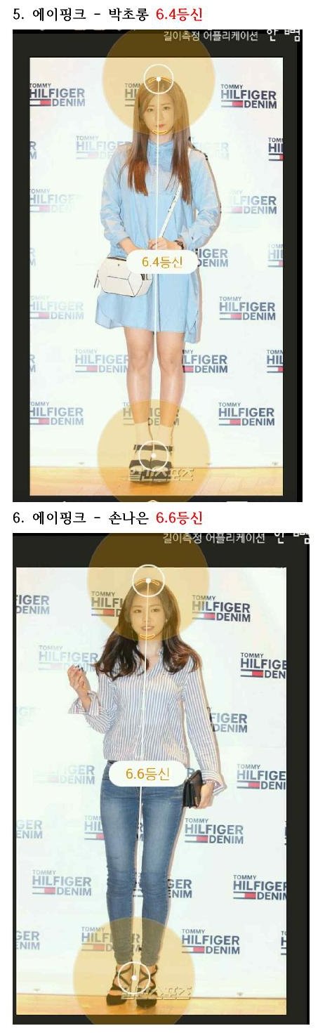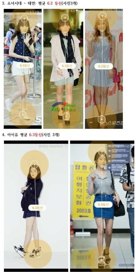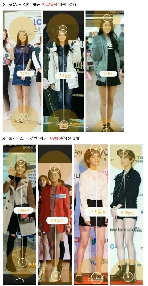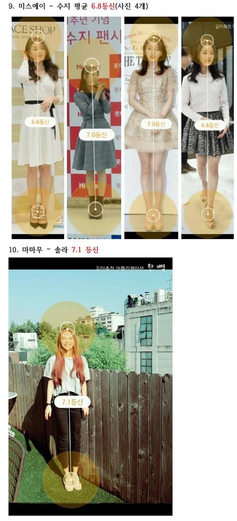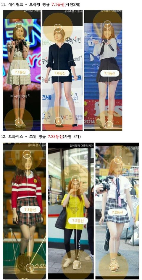 (굽 제외, 머리 뽕 제외-턱에서 정수리를 머리로 선정, 굽힘 제외, 화보 제외, 정면, 사진-구글링, 어플-한 뼘 이용)