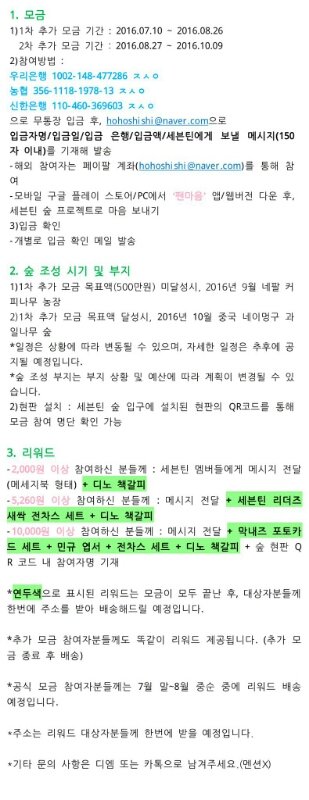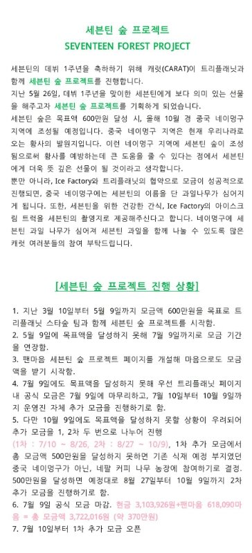 1. 세븐틴 숲 목표액(600만원)을 달성하지 못해 파랑짹에서 추가 모금 진행중