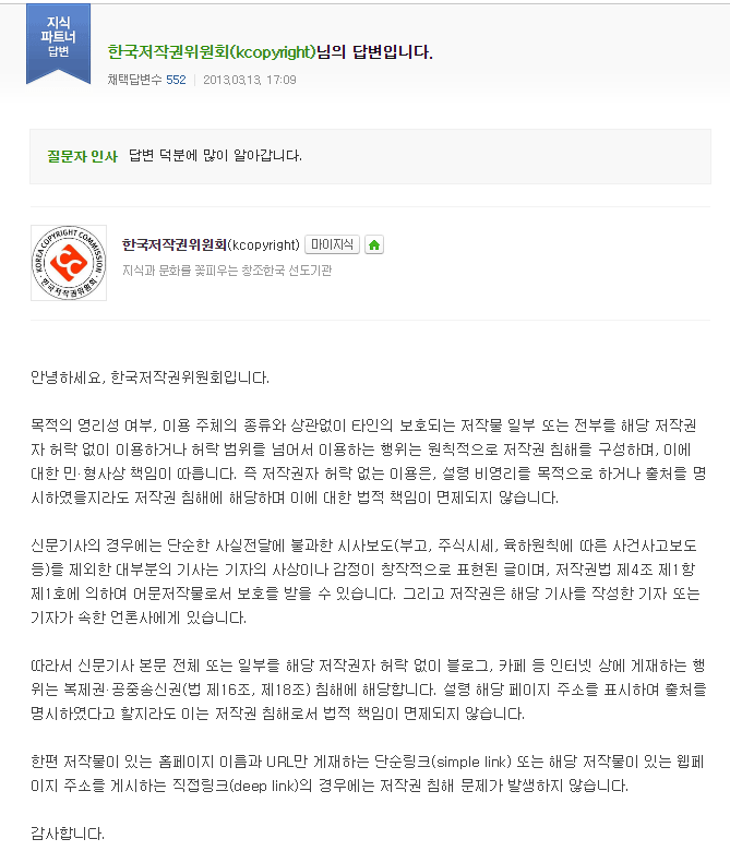 하지만 답변한 내용에서 '기사'라고 언급된 부분 때문에 경찰1은 내가 기자신분이 아니니 해당되지 않는다고 목소리 높였고, 잠시 당황한 저는 전체적으로 글을 꼼꼼히 살펴보다가 영리적 목적으로 퍼갔을 경우에는 저작권 위반이 된다는 내용을 찾아내 반박하며 똑같이 목소리 높였습니다.