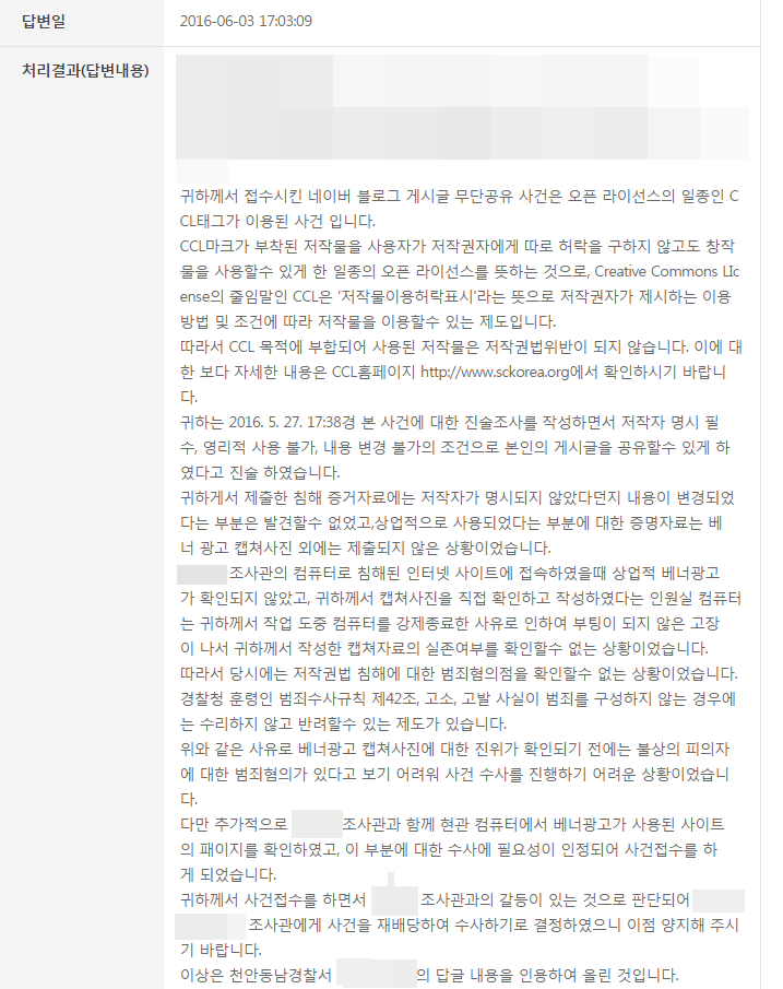몇년전 법률구조공단에까지 다녀오며 다 알아봤고 여러차례 고소장도 접수한 사실이 있다고 주장했지만 경찰1은 저작권 출처가 되어있으면 접수가 안된답니다. 법조항을 대면서 합리적으로 반박을 하는거였으면 이해하고 납득이라도 했을 것입니다. 그러나 경찰1은 그저 저작권 출처가 되어 있으니 저작권 위반이 아니라고만 말하며 억지만 부리는것에 불과했습니다.