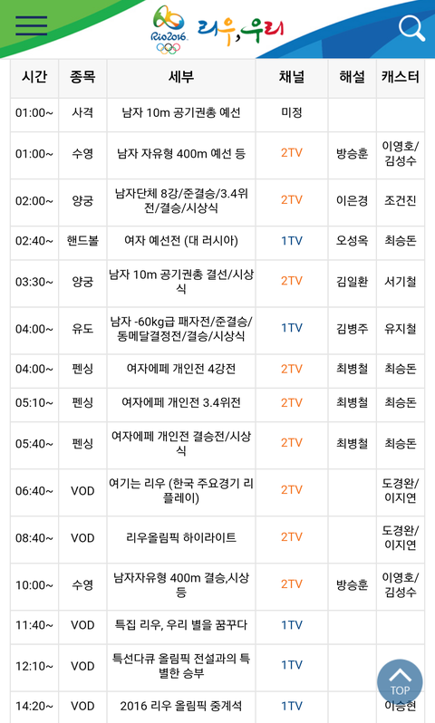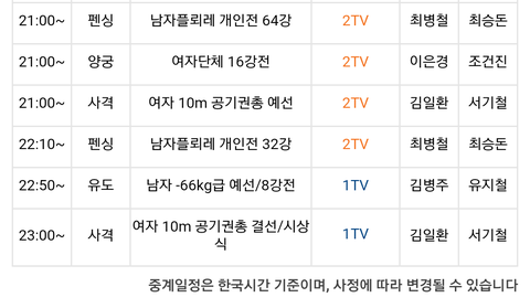 8월 7일(일요일) 올림픽 경기일정