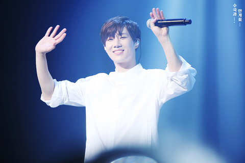 2016년 8월 6일 블루스퀘어 삼성카드홀에서 열린 '인피니트:그 해 여름3'에서 인피니트 리더 성규가 팬들에게 해맑은 손인사를 보내고 있다