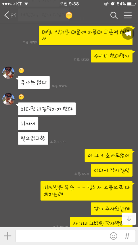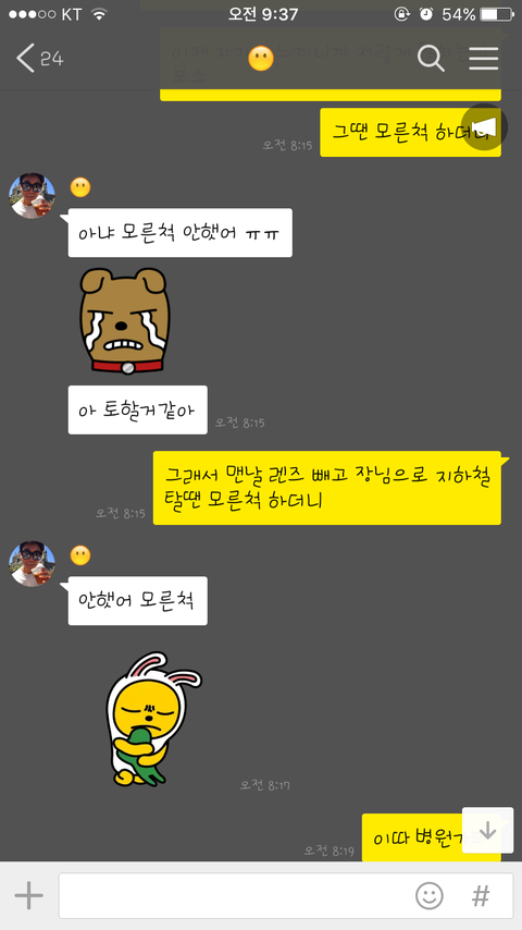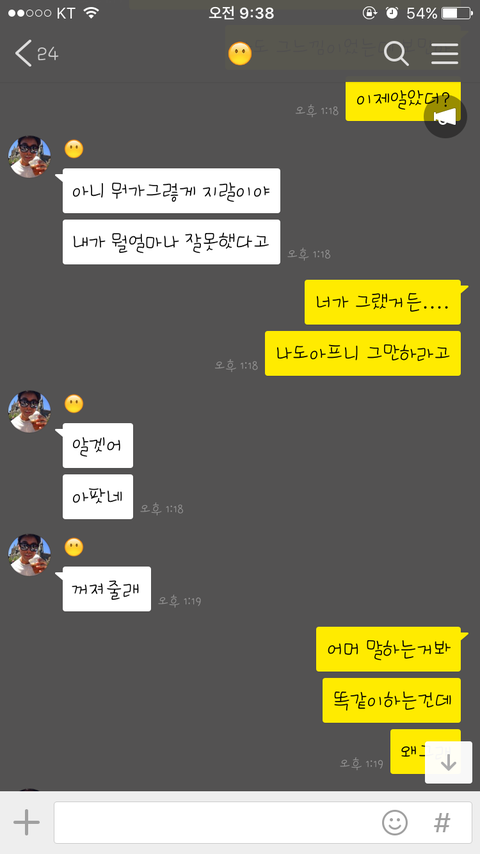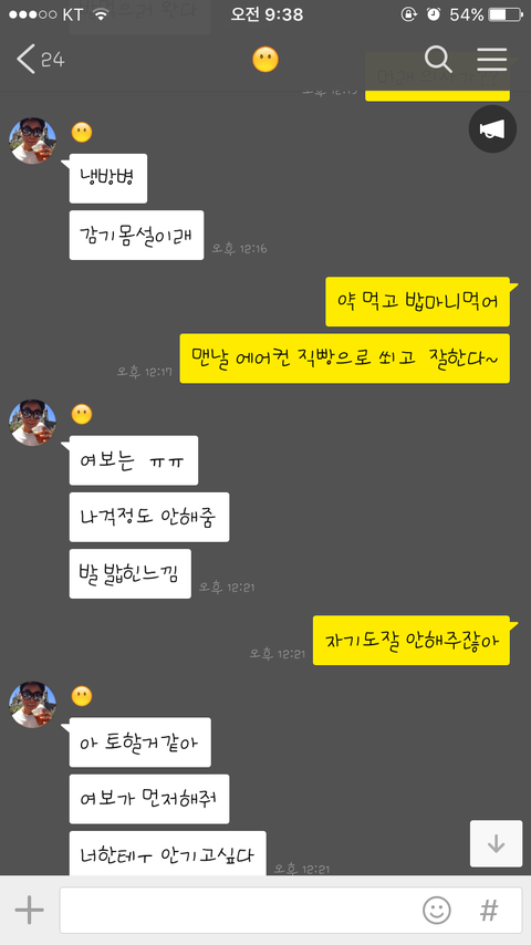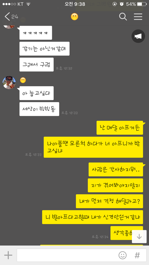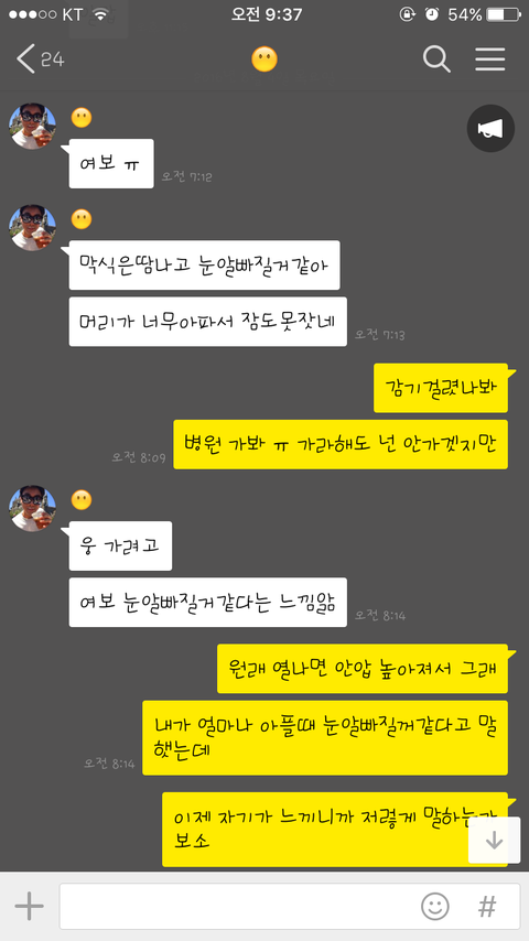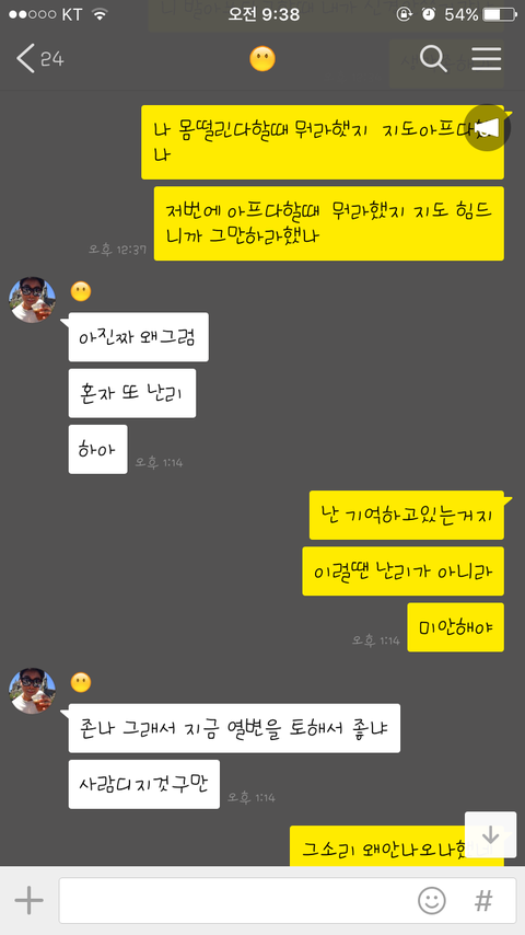 처음엔 걱정되다가 갑자기 저 아팠을때 생각이 나서 똑같이 했어요.. 그 일로 카톡보면 엄청 싸우고 있는 거에요 남자친구가 매번 아플때 마다 이런 것도 아니고 이번 한번 똑같이 했다고 저렇게 화가나나 싶어요