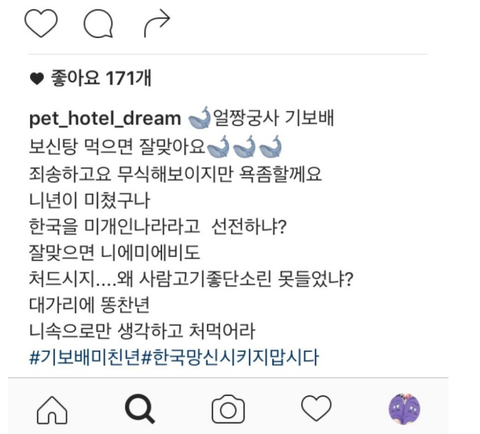 미개하게 어디 남의 집 귀한 딸한테 년년거려? 못 배워먹었나 진짜.. 소 닭 돼지는 환장하고 잡아먹으면서 그저 개한테만 이중잣대 내세워가지고... 진짜 개 사랑한다면 유기견 문제나 식용견들 도축이 법제화 돼서 관리가 잘 되도록 바라는게 맞다고 본다 애꿎은 남한테 욕질이나 하지 말고 개고기 먹었다고 애미애비 찾는 거 보니까 진짜 끕 떨어져서 나원참