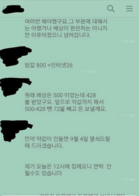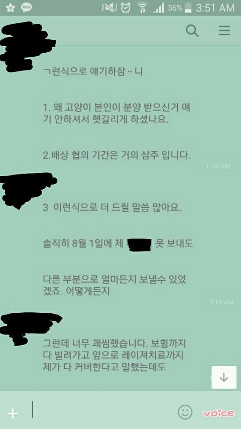 주황색으로 가린게 제 이름이고, 첫 카톡내용은 배상비 보낸 직후입니다.