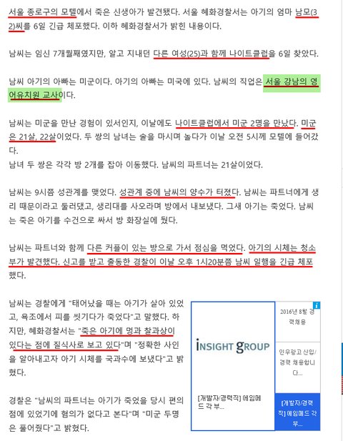 1줄 요약: 미군 아기 임신한 30대 영어유치원 교사가 홍대 클럽에서 21살 미군과 만나 모텔에서 원나잇하다가 양수 터져 아기 출산.