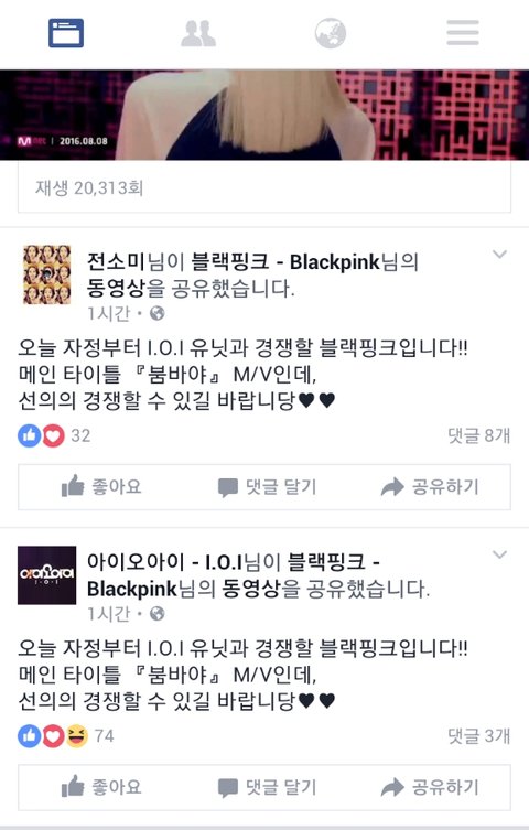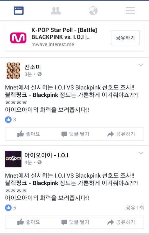 팬페이지도웃긴게 아이오아이팬페이지면 아이오아이소식만 올리면되는걸 굳이 블랙핑크동영상공유해서 당연히이기죠! 라는식으로나오고 댓글에는 얘네가누구냐고부터시작해서 존1나별로다