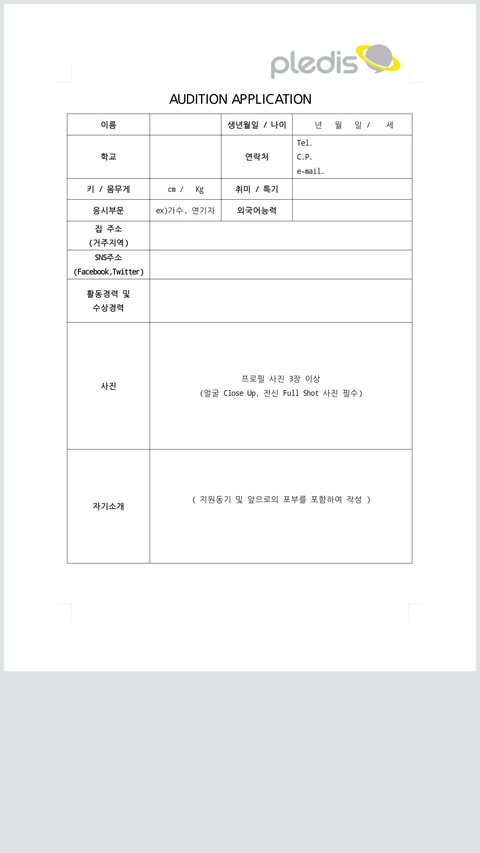 이게 오디션 지원서야 이걸로 1차오디션을보는거