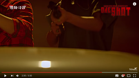 뮤비 중간에 멤버들이 총을 쏘는 장면인데 오른쪽 코너에 ONE SHOT 글씨를 확대해보면
