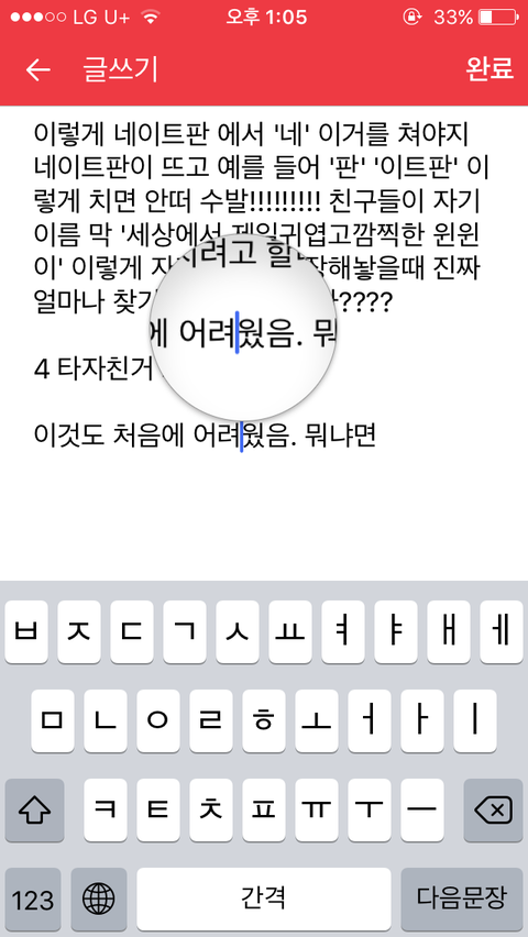 이것도 처음에 어려웠음. 뭐냐면 타자칠때 오타쳐가지고 고치려고 안녕 에서 '안' 이랑 '녕' 사이를 계속 터치해도 못고침 꼭 이렇게 해야됨