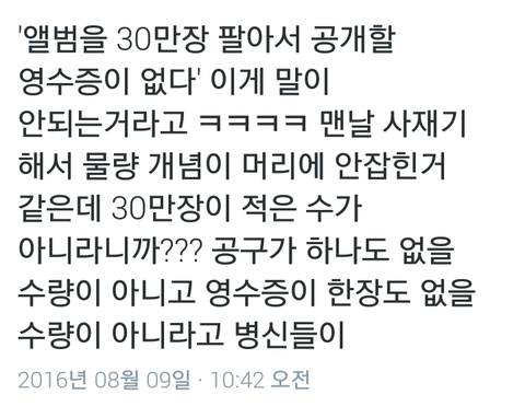 ???????????30만장 각자 사면 안 되는 부분?????????30만장 중에 공구 없으면 그냥 ㅅㅈㄱ인 거????아니 시펄 증거는 지들이 들고 와야지 왜 자꾸 안 했다고 주장하는 우리한테 들고오랰ㅋㅋㅋㅋㅋㅋㅋㅋㅋ진짜 범죄 용의자가 난 죄가 없어!!결백해!!이러는데 그럼 니가 결백하다는 증거를 들고와!!이러는 미친 검사라도 있던가ㅋㅋㅋㅋㅋ제발 ㅅㅈㄱ로 몰아가고 싶으면 증거를 가져왔으면 좋겠다...