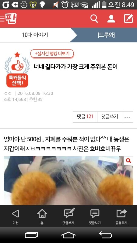 얼마야 난 500원.. 지폐를 주워본 적이 없다^^ 내 동생은 지갑이래ㅅㅂㅋㅋㅋㅋㅋㅋㅋ 사진은 호비호비뀨우