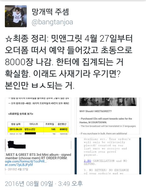 R.T 부탁해 이삐들...아까부터 자꾸 부탁만 해서 미안하다...내가 팔.로워 없는 불쌍한 닝겐이라....ㅠㅠㅠㅠㅠ많이 많이 R.T 해줘ㅠㅠㅠ자꾸 밋앤그릿 주문 5월 4일부터 했는데 왜 초동에 넣냐고 주작질하지 말라고 하는 애들이 있어서 이건 꼭 알려져야 될 것 같아서...팔천장 물량 증거까지 있어! 한터에 반영된다는 얘기도 있고....이게 알려져야 확실히 정리될 것 같아서ㅠㅠ미안해 이삐들 ㅠㅠ