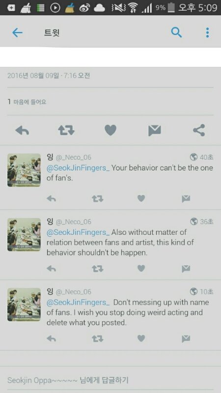 BTS로부터 블락당한 이유는 BTS의 잘못이 아니라 트위터의 오류이다. 당신의 행동은 팬의 행동이라고 볼 수 없다. 팬과 가수사이의 관계를 떠나서, 이런 종류의 행위는 일어나면 안된다. 팬이라는 이름을 망치지 마라. 이상한 행동 하기를 멈추고 당신이 올린 글을 지워주길 바란다.